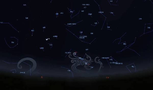接著到了春分,龍就慢慢從地平線上升起來,也就是九二爻的『見龍在田』,龍出現在田野,農民曆『二月二,龍抬頭』,在台灣是土地公誕辰。(圖下為龍抬頭,可以看見青龍是緊貼著地平線)